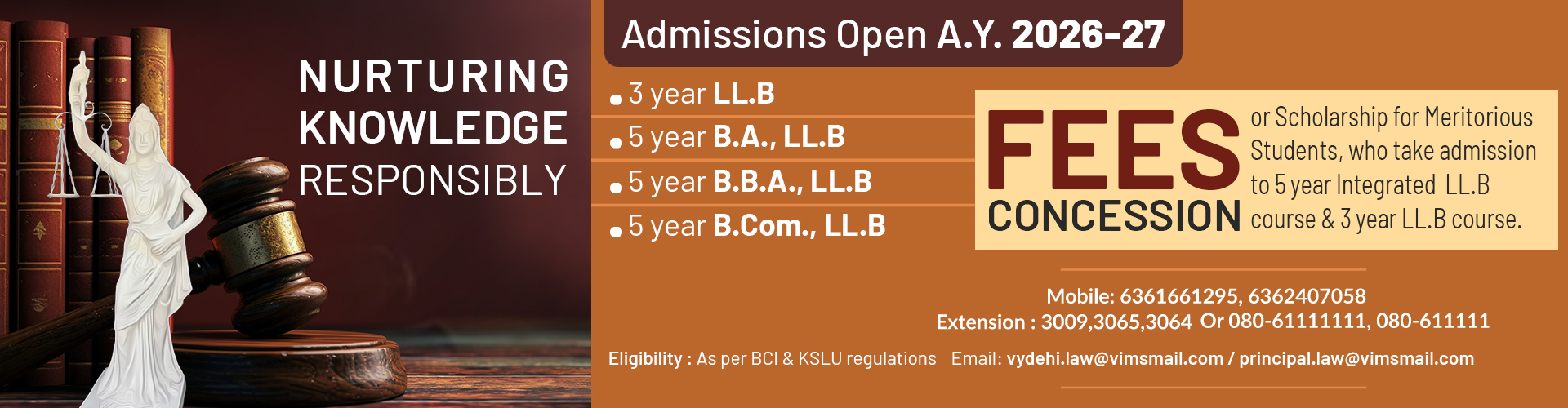 Vydehi Institute of Law, established by SRINIVASA TRUST, aims to impart quality legal education to students from all sections of society without any discrimination. Recognized as one of the best law colleges in Bangalore, the institution is strategically located in the IT hub of Bengaluru, i.e., Whitefield. It is affiliated with Karnataka State Law University, Hubballi, and approved by the Bar Council of India (BCI), New Delhi.